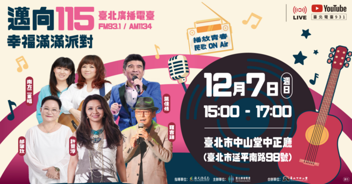 在那個一把吉他就能唱出夢想的年代,他們用筆寫下了青春的詩,用旋律記錄時代的心跳。 歲末時分,臺北廣播電臺誠摯邀請您參加「邁向115-幸福滿滿派對」,一起聆聽創作者們的青春故事、感受一首首經典民歌陪伴我